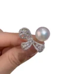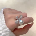 Simple zircon bow artificial pearl open ring high-grade super fairy index finger ring commuting new hand jewelry for women